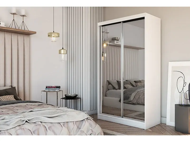 150 cm Kleiderschrank Darix mit Spiegel inklusive 2 Schiebetüren Schwebetürenschrank (Farbe: weiß) Schneller Versand