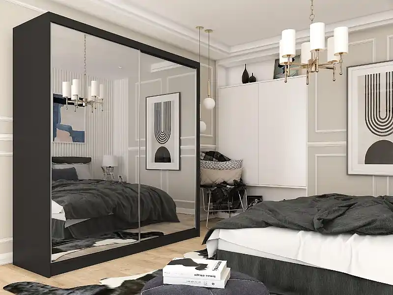 200 cm Kleiderschrank Darix mit Spiegel inklusive 2 Schiebetüren Schwebetürenschrank (Farbe: schwarz) Abverkauf