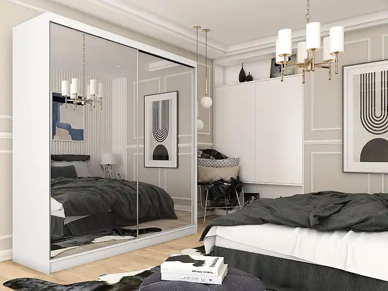 200 cm Kleiderschrank Darix mit Spiegel inklusive 2 Schiebetüren Schwebetürenschrank (Farbe: weiß) Ausverkauf
