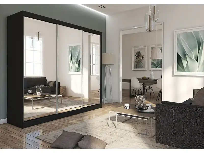 240 cm Kleiderschrank Darix mit Spiegel inklusive 3 Schiebetüren Schwebetürenschrank (Farbe: schwarz) Kostenfreie Lieferung