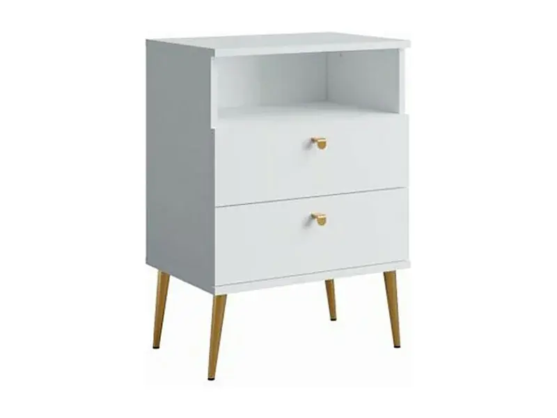 Abverkauf Nachttisch AURORA – 2 Schubladen + Ablage – Alpinweiß und goldene Füße