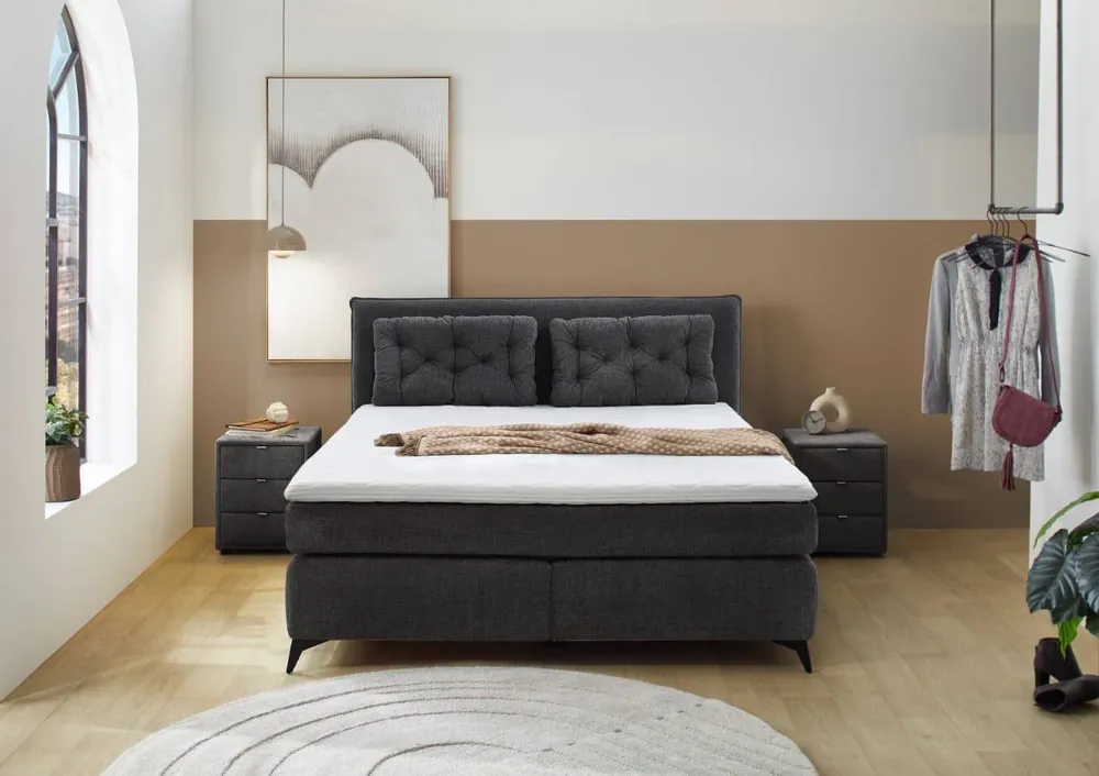 Luxuriöses Boxbett Atlantis | Stilvolles Design & maximaler KomfortLuxuriöses Boxbett Atlantis: Stilvolles Design trifft auf außergewöhnlichen Komfort Das Boxbett Atlantis bringt Eleganz und Funktionalität in Ihr Schlafzimmer. Mit seiner modernen Optik und den vielfältigen Farboptionen fügt es sich harmonisch in jede Einrichtung ein. Verfügbar in den Größen 120x200cm bis 180x200cm, bietet dieses Bett nicht nur eine komfortable Schlafgelegenheit, sondern auch wertvollen Stauraum. Design und Ästhetik für Ihr Zuhause Dieses stilvolle Boxbett ist in sieben Farben erhältlich, darunter dark grey und anthrazit, und passt sich mühelos verschiedenen Schlafzimmerstilen an. Mit seiner eleganten Kopfteilstruktur und dem hochwertigen Flachgewebe, das sowohl robust als auch pflegeleicht ist, wird das Atlantis zum Highlight in Ihrem Zuhause. Unvergleichlicher Komfort durch hochwertige Materialien Der Kern des Boxbetts besteht aus einem 4-Gang-Bonellfederkern, der in Kombination mit dem 4 cm dicken H30 Topper eine ideale Schlafunterlage bildet. Diese Kombination garantiert eine ergonomische Liegeposition und einen erholsamen Schlaf. Das Flachgewebe ist nicht nur optisch ansprechend, sondern auch langlebig und pflegeleicht, was für eine langanhaltende Freude am Produkt sorgt. Maße im Überblick für die ideale Anpassung an Ihren Raum Gesamt: 125 x 240 cm (Liegefläche 120 x 200 cm) Gesamt: 145 x 240 cm (Liegefläche 140 x 200 cm) Gesamt: 165 x 240 cm (Liegefläche 160 x 200 cm) Gesamt: 185 x 240 cm (Liegefläche 180 x 200 cm) Liegehöhe: 56 cm Kopfteilhöhe: 102 cm Topperhöhe: 4 cmFunktionalität trifft auf stilvollen Stauraum Das Atlantis Boxbett bietet mehr als nur eine Schlafgelegenheit. Der integrierte Bettkasten und der Stauraum im Kopfteil bieten Platz für Bettwäsche und andere Utensilien. Mit Abmessungen von 240 cm in der Länge und einer Liegehöhe von 56 cm fügt sich das Bett nahtlos in jedes Schlafzimmer ein und bietet gleichzeitig ausreichend Platz für Ihre Bedürfnisse. Individuelle Anpassung Erhältlich in mehreren Größen und Farben, können Sie das Boxbett Atlantis nach Ihren Wünschen anpassen. Zusätzlich bietet Myhomelando flexible Ratenzahlungen und eine Bestpreisgarantie, um Ihnen den Kauf so angenehm wie möglich zu gestalten. Ihre beste Wahl für Komfort und Stil Mit dem Boxbett Atlantis holen Sie sich nicht nur ein stilvolles Möbelstück, sondern auch höchsten Schlafkomfort ins Haus. Dank seiner Funktionalität und den vielfältigen Anpassungsmöglichkeiten ist es die ideale Wahl für jedes Schlafzimmer.