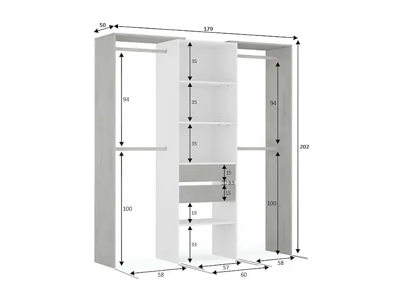 Aktuell Garderobe Dalala, Struktur für begehbaren Kleiderschrank, Offener Kleiderschrank ohne Türen, Begehbarer Kleiderschrank, 179x50h202 cm, Weiß und Zement