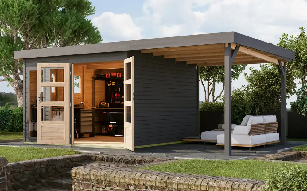 Anbaudach-Gartenhaus terragrau aus nordischer Fichte mit Doppelflügeltür, 2 großen und 2 kleinen Fenstern, Flachdach, Zylinderschloss, 2,98 × 3,02 m