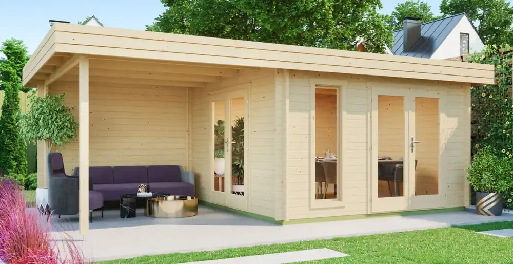 Das moderne Gartenhaus G285 ist perfekt für die Erweiterung ihres Wohnraumes. Die 44 mm starken Blockbohlen werden aus nordischem Fichtenholz gefertigt. Die Seitenwandhöhe beträgt 222 cm. Die Doppeltür mit dem Durchgangsmaß 158,8 x 195,7 cm verfügt über ein Zylinderschloss und Lichtausschnitte.