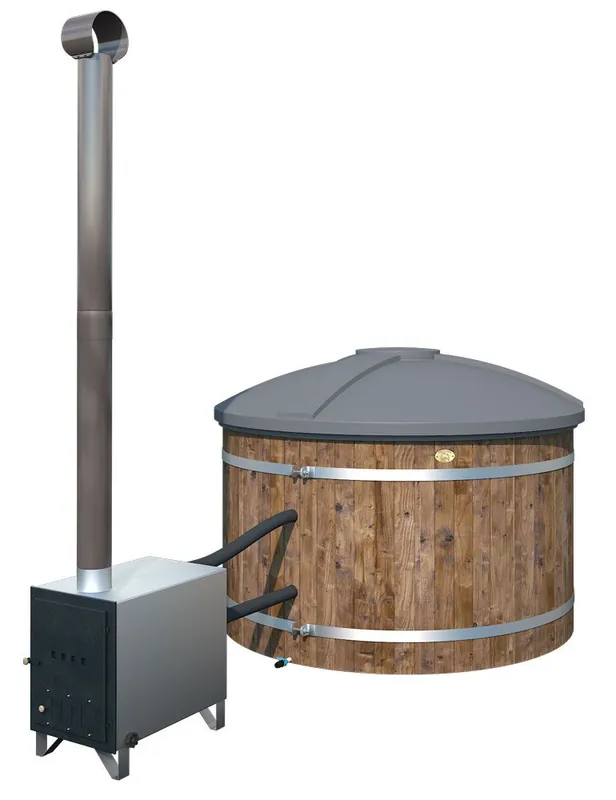 Der Deckel des Hot Tubs besteht aus PE-Kunststoff (Polyethylen-Kunststoff) und ist UV-beständig. Die geformte Sitzfläche ist mit 40 cm dickem Polystyrol Schaum isoliert und bietet Platz für 6 Personen. Der geformte Innenraum aus PE-Kunststoff ist sehr leicht zu reinigen. Der Hot Tub (mit Deckel) ist sehr hitze-, kälte- und witterungsbeständig und mit einem Abflusssystem und Wasserhahn ausgestattet. Dank des Deckels erwärmt sich das Wasser schneller und bei geschlossenem Deckel gelangt kein Schmutz oder Schlamm ins Wasser. Es ist möglich, den Ofen mit Brennholz (ca. 50 cm lang) zu heizen. In diesem Fall beträgt die Aufheizzeit des Wassers ca. 3 bis 3,5 Stunden. Mit Holzbriketts ist die Aufheizzeit des Wassers ca. 2 bis 2,5 Stunden. Der Brikettbedarf ist ca. 20 kg.