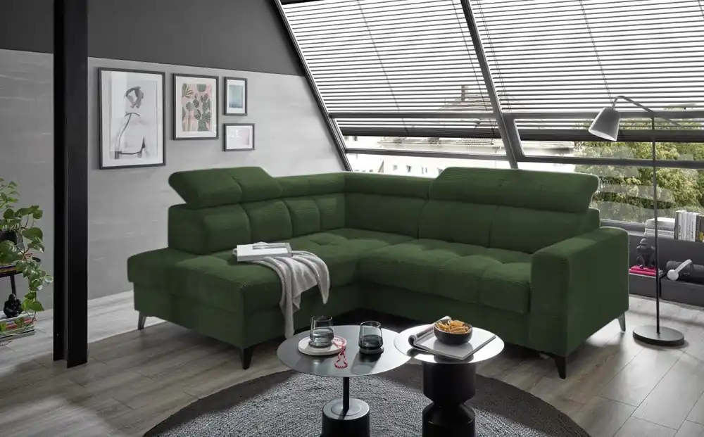 Stylisches Ecksofa Anton mit Schlaffunktion und Bettkasten beidseitig montierbar im robustem Luxus-Webstoff Flachgewebe  Auf die Plätze, Fertig, Los! Auf dem Ecksofa Anton von Black Red White mit einem Stellmaß von 289 x 189 ist genügend Platz, damit sich jeder seinen Lieblingsplatz sichern kann. Die knautschige Optik, die voluminösen und gemütlichen Polster mit vielen Kissen lassen das Ecksofa schnell zu ihrem persönlichen Lieblingsplatz werden. Der Besuch möchte doch spontan über Nacht bleiben? Eine integrierte Schlaffunktion lässt Anton im Handumdrehen in ein angenehmes Gästebett mit einer Liegefläche von 222 x 118 cm verwandeln. Das nötige Bettzeug können Sie einfach in dem unter der Bettfunktion gelegenen Bettkasten verstauen. Wählen Sie aus einer von vielen verfügbaren Farben und passen Sie Anton ihrem Wohnzimmer an. Das Sofa kann wahlweise mit Liegefläche links oder rechts aufgebaut werden. Finde bei Myhomelando dein Traumsofa für dein zuhause !!! Maße Ecksofa – alle Maße sind ca. Angaben Gesamt: 289 x 189 cm oder 189 x 289 cm Sitztiefe: 50 cm Sitzhöhe: 42 cm Rückenhöhe: 85 cm Ohne abgebildete Deko wie Kissen etc., Farbe auf dem Foto kann leicht vom Original abweichen (Bildschirm)