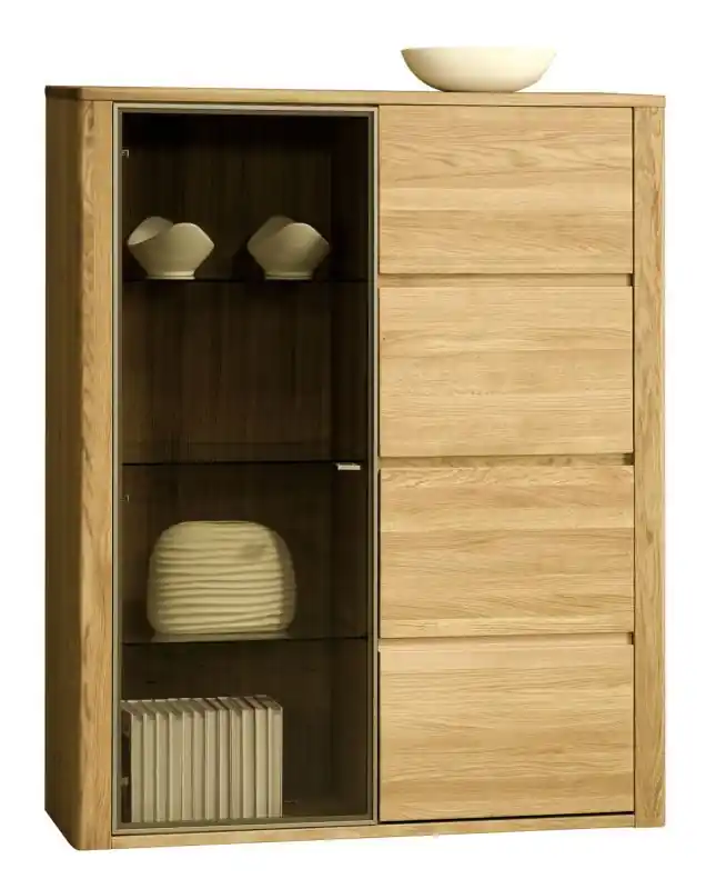 Die Vitrine aus der Serie Jussara bietet hinter einer Glastür und zwei Türen jede Menge Stauraum. Das vorhandene SoftClose-System sorgt bei den Massivholztüren für ruhiges Schließen. Die geölte Oberfläche der Vitrine ist besonders schön anzusehen. Egal, ob im Wohnzimmer, Schlafzimmer oder Flur, die Vitrine macht sich überall gut.