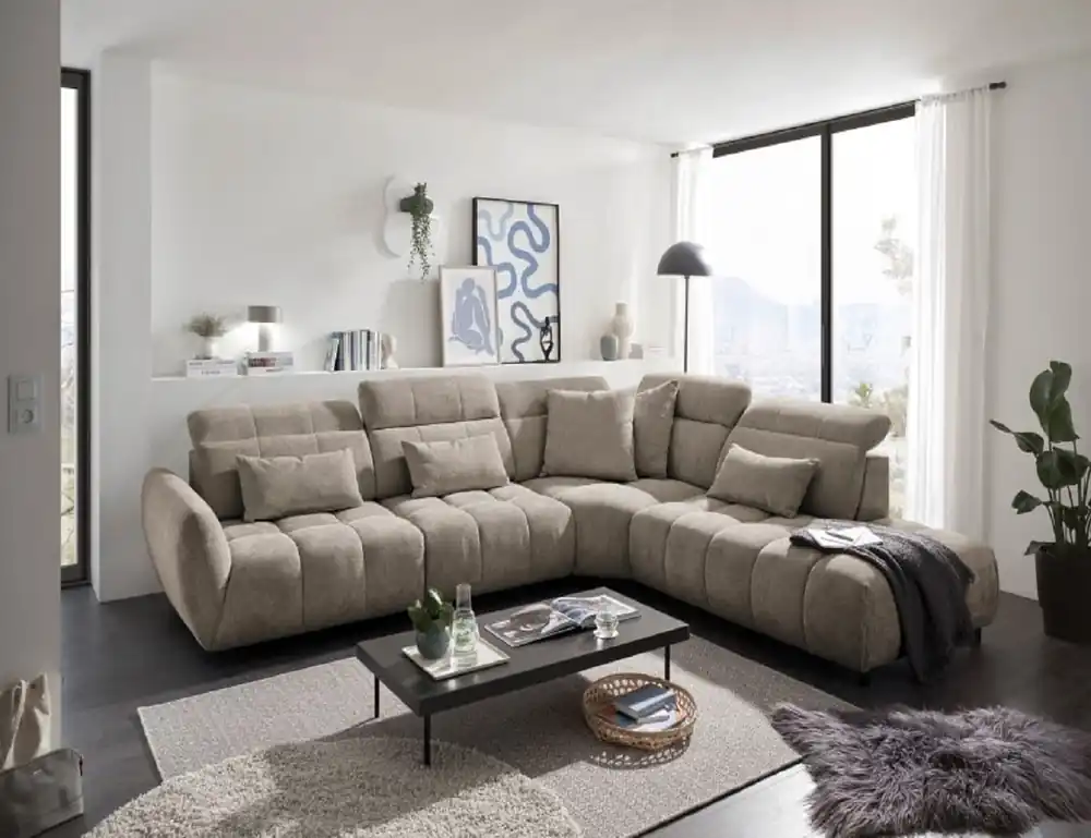 Stylisches Ecksofa Anton mit Schlaffunktion und Bettkasten beidseitig montierbar im robustem Luxus-Webstoff Flachgewebe Auf die Plätze, Fertig, Los! Auf dem Ecksofa Anton von Black Red White mit einem Stellmaß von 289 x 189 ist genügend Platz, damit sich jeder seinen Lieblingsplatz sichern kann. Die knautschige Optik, die voluminösen und gemütlichen Polster mit vielen Kissen lassen das Ecksofa schnell zu ihrem persönlichen Lieblingsplatz werden. Der Besuch möchte doch spontan über Nacht bleiben? Eine integrierte Schlaffunktion lässt Anton im Handumdrehen in ein angenehmes Gästebett mit einer Liegefläche von 222 x 118 cm verwandeln. Das nötige Bettzeug können Sie einfach in dem unter der Bettfunktion gelegenen Bettkasten verstauen. Wählen Sie aus einer von vielen verfügbaren Farben und passen Sie Anton ihrem Wohnzimmer an. Das Sofa kann wahlweise mit Liegefläche links oder rechts aufgebaut werden. Finde bei Myhomelando dein Traumsofa für dein zuhause !!! Maße Ecksofa – alle Maße sind ca. Angaben Gesamt: 289 x 189 cm oder 189 x 289 cm Sitztiefe: 50 cm Sitzhöhe: 42 cm Rückenhöhe: 85 cm Ohne abgebildete Deko wie Kissen etc., Farbe auf dem Foto kann leicht vom Original abweichen (Bildschirm)