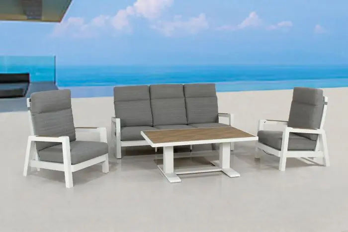 sorgt für eine harmonische Optik, während die 20 cm dicken Sitzkissen und die Rückenkissen ein Höchstmaß an Komfort bieten. Die edlen Latten aus wetterfesten Verbundwerkstoff in Holzoptik verleihen dem Tisch und dem Beistelltisch nicht nur eine moderne Optik, sondern auch eine angenehme Haptik.