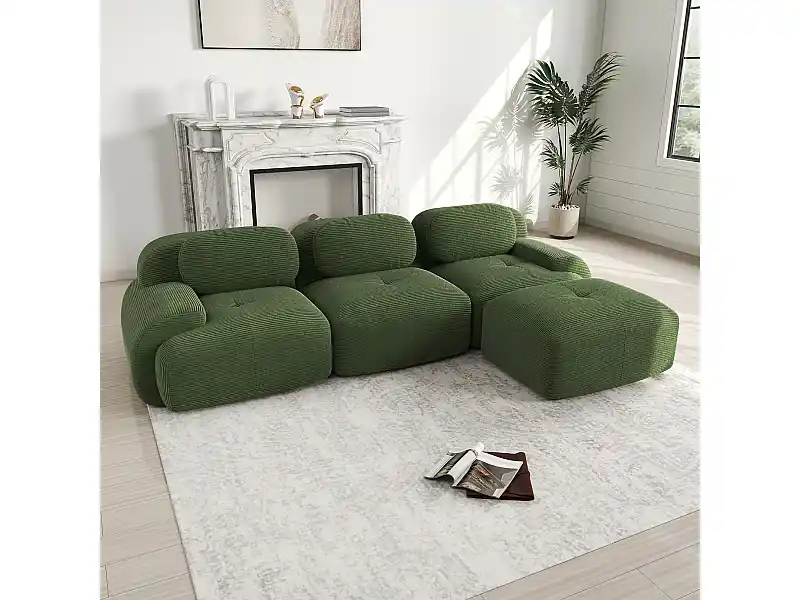 Ecksofa 3-Sitzer mit gepolsterter Rückenlehne und Hocker – grüner Cord Garantierte Lieferung