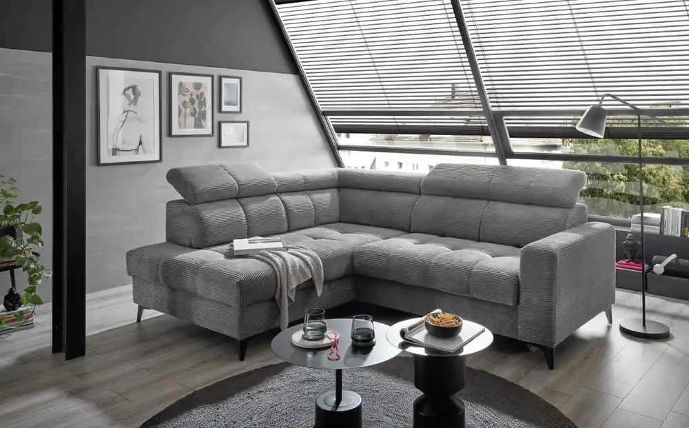 Stylisches Ecksofa Anton mit Schlaffunktion und Bettkasten beidseitig montierbar im robustem Luxus-Webstoff Flachgewebe  Auf die Plätze, Fertig, Los! Auf dem Ecksofa Anton von Black Red White mit einem Stellmaß von 289 x 189 ist genügend Platz, damit sich jeder seinen Lieblingsplatz sichern kann. Die knautschige Optik, die voluminösen und gemütlichen Polster mit vielen Kissen lassen das Ecksofa schnell zu ihrem persönlichen Lieblingsplatz werden. Der Besuch möchte doch spontan über Nacht bleiben? Eine integrierte Schlaffunktion lässt Anton im Handumdrehen in ein angenehmes Gästebett mit einer Liegefläche von 222 x 118 cm verwandeln. Das nötige Bettzeug können Sie einfach in dem unter der Bettfunktion gelegenen Bettkasten verstauen. Wählen Sie aus einer von vielen verfügbaren Farben und passen Sie Anton ihrem Wohnzimmer an. Das Sofa kann wahlweise mit Liegefläche links oder rechts aufgebaut werden. Finde bei Myhomelando dein Traumsofa für dein zuhause !!! Maße Ecksofa – alle Maße sind ca. Angaben Gesamt: 289 x 189 cm oder 189 x 289 cm Sitztiefe: 50 cm Sitzhöhe: 42 cm Rückenhöhe: 85 cm Ohne abgebildete Deko wie Kissen etc., Farbe auf dem Foto kann leicht vom Original abweichen (Bildschirm)