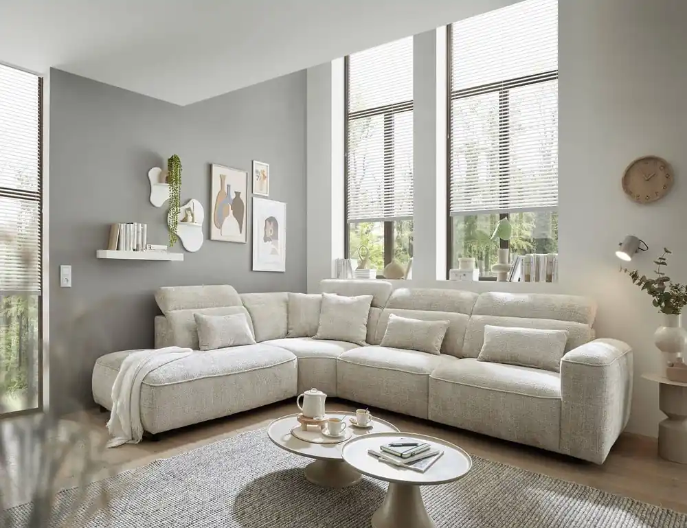 Ecksofa Mansfield Farbe taupe mit 5-fach verstellbaren Kopflehnen und Mikrofaser-Chenille-Bezug – ED Exciting Design Sale
