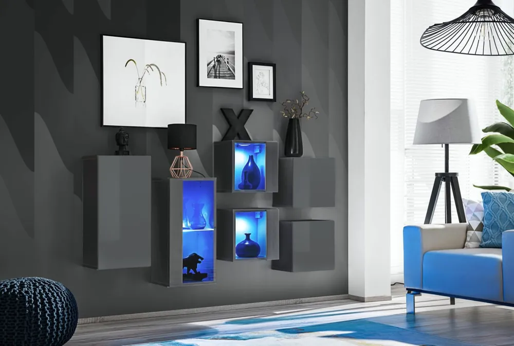 Elegantes Set von Hängeschränke / Hängevitrinen Volleberg 99, Farbe: Grau – Abmessungen: 80 x 150 x 25 cm (H x B x T), 6 teilig