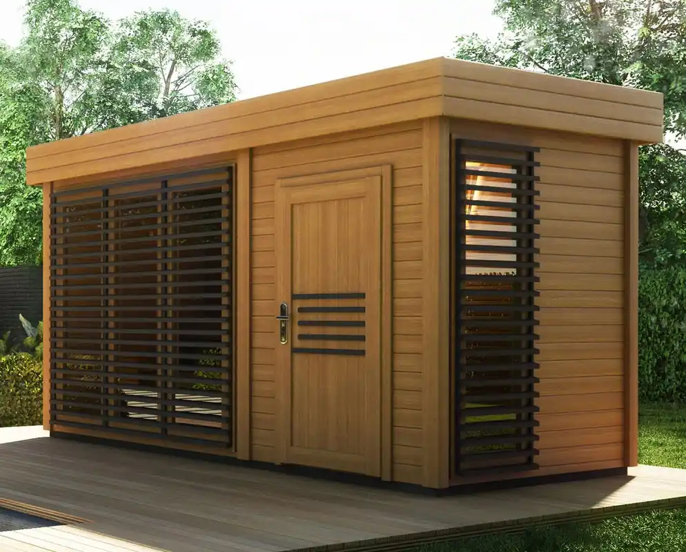 Saunahaus ist auch spiegelverkehrt erhältlich – unbedingt bei der Bestellung Service kontaktieren!