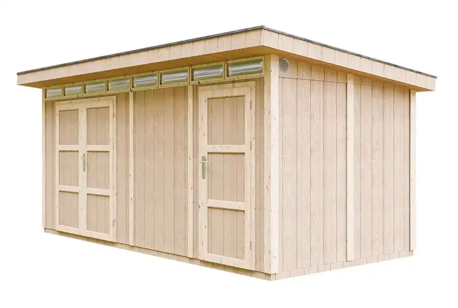 Gerätehaus Waldenstein mit 1 Doppeltür und 1 Einzeltür, Fußboden und Dachschindeln inkludiert, Nutzfläche: 11,5 m², kleine Fenster, 236 x 486 cm