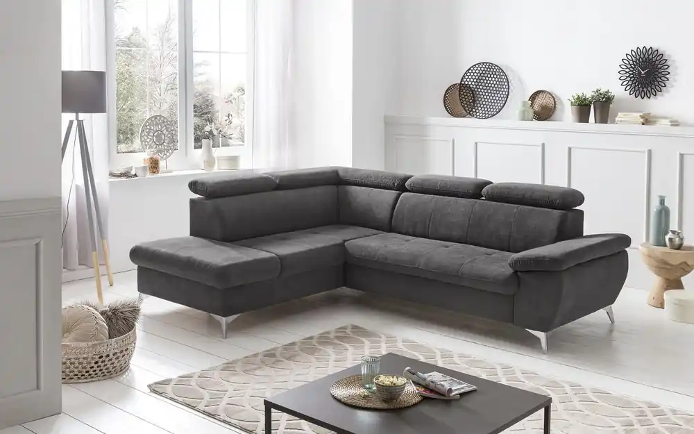 Stylisches Ecksofa Anton mit Schlaffunktion und Bettkasten beidseitig montierbar im robustem Luxus-Webstoff Flachgewebe  Auf die Plätze, Fertig, Los! Auf dem Ecksofa Anton von Black Red White mit einem Stellmaß von 289 x 189 ist genügend Platz, damit sich jeder seinen Lieblingsplatz sichern kann. Die knautschige Optik, die voluminösen und gemütlichen Polster mit vielen Kissen lassen das Ecksofa schnell zu ihrem persönlichen Lieblingsplatz werden. Der Besuch möchte doch spontan über Nacht bleiben? Eine integrierte Schlaffunktion lässt Anton im Handumdrehen in ein angenehmes Gästebett mit einer Liegefläche von 222 x 118 cm verwandeln. Das nötige Bettzeug können Sie einfach in dem unter der Bettfunktion gelegenen Bettkasten verstauen. Wählen Sie aus einer von vielen verfügbaren Farben und passen Sie Anton ihrem Wohnzimmer an. Das Sofa kann wahlweise mit Liegefläche links oder rechts aufgebaut werden. Finde bei Myhomelando dein Traumsofa für dein zuhause !!! Maße Ecksofa – alle Maße sind ca. Angaben Gesamt: 289 x 189 cm oder 189 x 289 cm Sitztiefe: 50 cm Sitzhöhe: 42 cm Rückenhöhe: 85 cm Ohne abgebildete Deko wie Kissen etc., Farbe auf dem Foto kann leicht vom Original abweichen (Bildschirm)