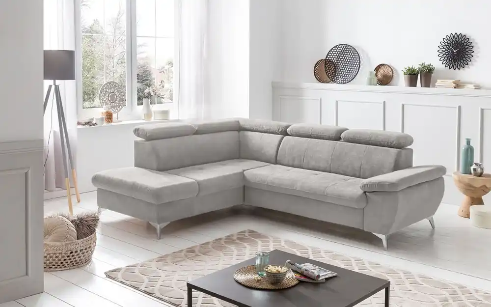 Stylisches Ecksofa Anton mit Schlaffunktion und Bettkasten beidseitig montierbar im robustem Luxus-Webstoff Flachgewebe Auf die Plätze, Fertig, Los! Auf dem Ecksofa Anton von Black Red White mit einem Stellmaß von 289 x 189 ist genügend Platz, damit sich jeder seinen Lieblingsplatz sichern kann. Die knautschige Optik, die voluminösen und gemütlichen Polster mit vielen Kissen lassen das Ecksofa schnell zu ihrem persönlichen Lieblingsplatz werden. Der Besuch möchte doch spontan über Nacht bleiben? Eine integrierte Schlaffunktion lässt Anton im Handumdrehen in ein angenehmes Gästebett mit einer Liegefläche von 222 x 118 cm verwandeln. Das nötige Bettzeug können Sie einfach in dem unter der Bettfunktion gelegenen Bettkasten verstauen. Wählen Sie aus einer von vielen verfügbaren Farben und passen Sie Anton ihrem Wohnzimmer an. Das Sofa kann wahlweise mit Liegefläche links oder rechts aufgebaut werden. Finde bei Myhomelando dein Traumsofa für dein zuhause !!! Maße Ecksofa – alle Maße sind ca. Angaben Gesamt: 289 x 189 cm oder 189 x 289 cm Sitztiefe: 50 cm Sitzhöhe: 42 cm Rückenhöhe: 85 cm Ohne abgebildete Deko wie Kissen etc., Farbe auf dem Foto kann leicht vom Original abweichen (Bildschirm)