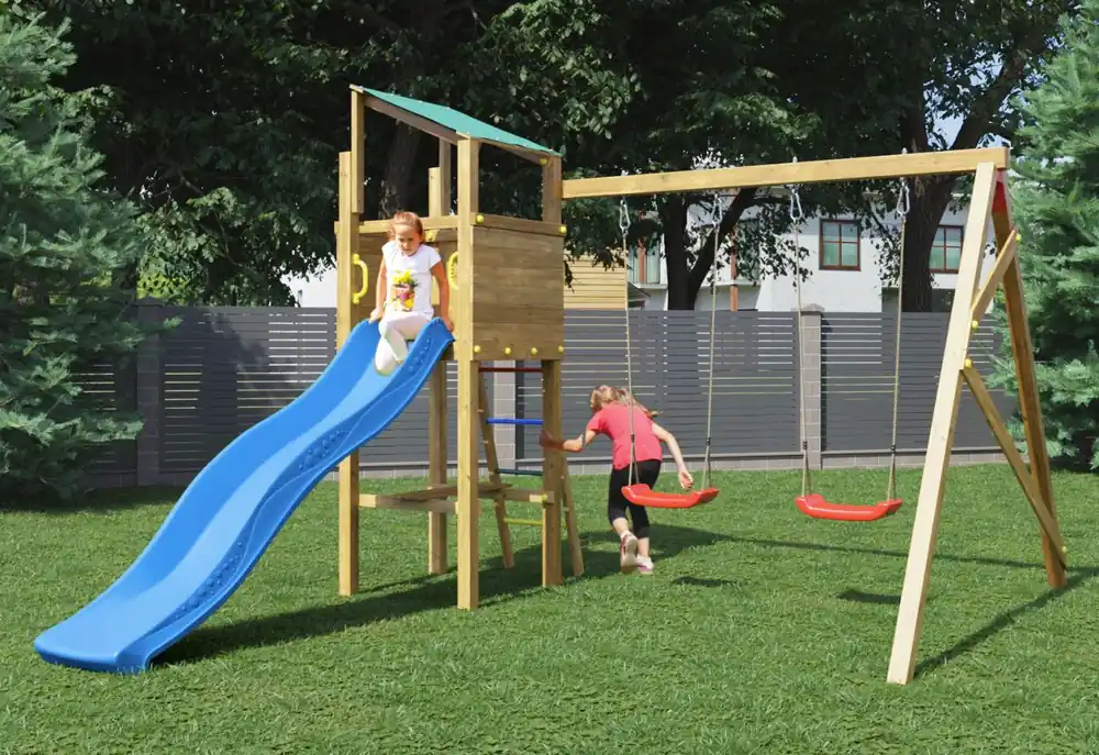 Danach geht es mit Schwung die große, wellenförmige Rutsche hinunter. Welch ein Spaß! Am besten gleich ein weiteres Mal den Turm hinauf und eine tolle Rutschpartie genießen! Ein besonderes Highlight des Spielturmes ist die knallig rote Schaukel. Auf ihnen genießen die Kids das Gefühl von Freiheit und Schwerelosigkeit und schwingen gemeinsam mit ihren Freunden um die Wette