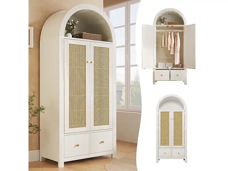 Kleiderschrank aus geflochtenem Rattan – 181 x 78 x 45 cm – Landhausstil mit Eichenoptik – mit Einlegeboden, 2 Türen und 2 Schubladen – Holz – weiß Kostenfreie Lieferung