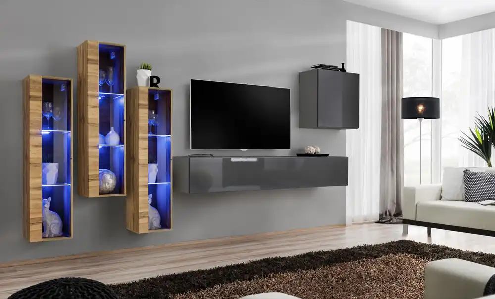 Bereichern Sie Ihr Wohnzimmer mit unserer modernen und ästhetischen Wohnwand im stylischen Design Balestrand 207 in der Farbe: Eiche Wotan / Grau. Die bemerkenswerte Wohnwand misst 160 x 330 x 40 cm (H x B x T) und ist mit fünf sogleich praktischen und eleganten Türen ausgestattet.
