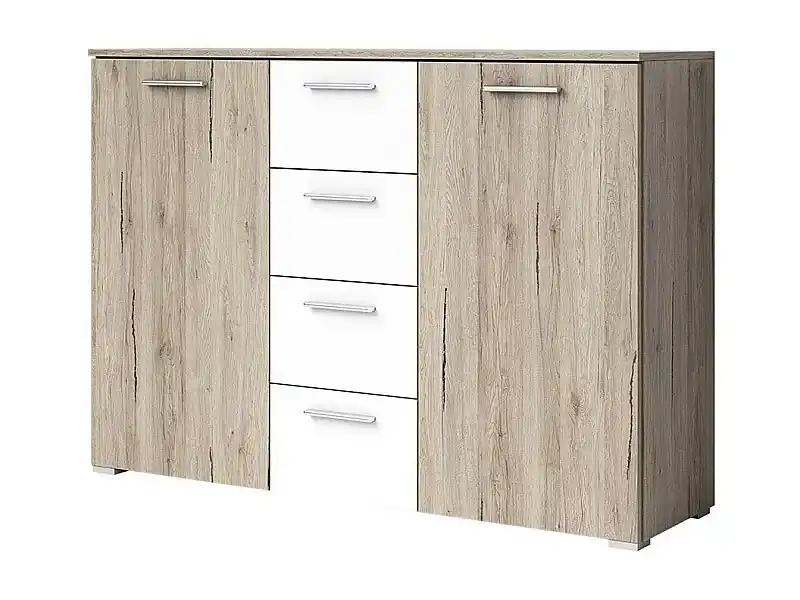 Letzte Chance Design-Kommode mit 2 Türen und 4 Schubladen, 130 cm. Kollektion EOS in hellem Eichen- und Weißdekor.