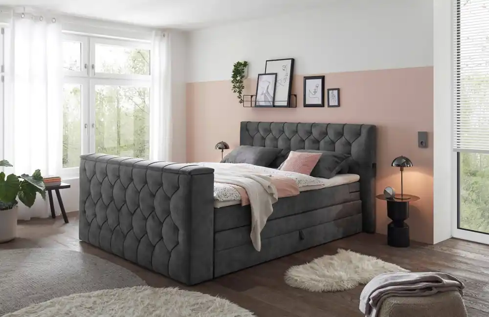 Luxuriöses Boxbett Atlantis | Stilvolles Design & maximaler KomfortLuxuriöses Boxbett Atlantis: Stilvolles Design trifft auf außergewöhnlichen Komfort Das Boxbett Atlantis bringt Eleganz und Funktionalität in Ihr Schlafzimmer. Mit seiner modernen Optik und den vielfältigen Farboptionen fügt es sich harmonisch in jede Einrichtung ein. Verfügbar in den Größen 120x200cm bis 180x200cm, bietet dieses Bett nicht nur eine komfortable Schlafgelegenheit, sondern auch wertvollen Stauraum. Design und Ästhetik für Ihr Zuhause Dieses stilvolle Boxbett ist in sieben Farben erhältlich, darunter dark grey und anthrazit, und passt sich mühelos verschiedenen Schlafzimmerstilen an. Mit seiner eleganten Kopfteilstruktur und dem hochwertigen Flachgewebe, das sowohl robust als auch pflegeleicht ist, wird das Atlantis zum Highlight in Ihrem Zuhause. Unvergleichlicher Komfort durch hochwertige Materialien Der Kern des Boxbetts besteht aus einem 4-Gang-Bonellfederkern, der in Kombination mit dem 4 cm dicken H30 Topper eine ideale Schlafunterlage bildet. Diese Kombination garantiert eine ergonomische Liegeposition und einen erholsamen Schlaf. Das Flachgewebe ist nicht nur optisch ansprechend, sondern auch langlebig und pflegeleicht, was für eine langanhaltende Freude am Produkt sorgt. Maße im Überblick für die ideale Anpassung an Ihren Raum Gesamt: 125 x 240 cm (Liegefläche 120 x 200 cm) Gesamt: 145 x 240 cm (Liegefläche 140 x 200 cm) Gesamt: 165 x 240 cm (Liegefläche 160 x 200 cm) Gesamt: 185 x 240 cm (Liegefläche 180 x 200 cm) Liegehöhe: 56 cm Kopfteilhöhe: 102 cm Topperhöhe: 4 cmFunktionalität trifft auf stilvollen Stauraum Das Atlantis Boxbett bietet mehr als nur eine Schlafgelegenheit. Der integrierte Bettkasten und der Stauraum im Kopfteil bieten Platz für Bettwäsche und andere Utensilien. Mit Abmessungen von 240 cm in der Länge und einer Liegehöhe von 56 cm fügt sich das Bett nahtlos in jedes Schlafzimmer ein und bietet gleichzeitig ausreichend Platz für Ihre Bedürfnisse. Individuelle Anpassung Erhältlich in mehreren Größen und Farben, können Sie das Boxbett Atlantis nach Ihren Wünschen anpassen. Zusätzlich bietet Myhomelando flexible Ratenzahlungen und eine Bestpreisgarantie, um Ihnen den Kauf so angenehm wie möglich zu gestalten. Ihre beste Wahl für Komfort und Stil Mit dem Boxbett Atlantis holen Sie sich nicht nur ein stilvolles Möbelstück, sondern auch höchsten Schlafkomfort ins Haus. Dank seiner Funktionalität und den vielfältigen Anpassungsmöglichkeiten ist es die ideale Wahl für jedes Schlafzimmer.