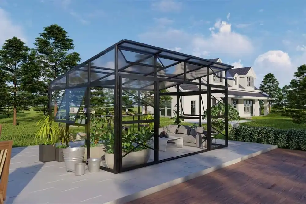 Gewächshaus Oregano 01, Ausführung: Hohlkammerplatten Dach 10 mm und Echtglas Wand 4 mm, Abmessungen: 271 x 271 x 241 cm (L x B x H), Farbe: Schwarz
