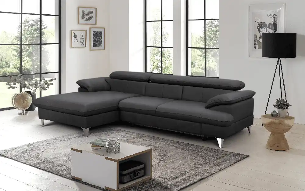 Stylisches Ecksofa Anton mit Schlaffunktion und Bettkasten beidseitig montierbar im robustem Luxus-Webstoff Flachgewebe  Auf die Plätze, Fertig, Los! Auf dem Ecksofa Anton von Black Red White mit einem Stellmaß von 289 x 189 ist genügend Platz, damit sich jeder seinen Lieblingsplatz sichern kann. Die knautschige Optik, die voluminösen und gemütlichen Polster mit vielen Kissen lassen das Ecksofa schnell zu ihrem persönlichen Lieblingsplatz werden. Der Besuch möchte doch spontan über Nacht bleiben? Eine integrierte Schlaffunktion lässt Anton im Handumdrehen in ein angenehmes Gästebett mit einer Liegefläche von 222 x 118 cm verwandeln. Das nötige Bettzeug können Sie einfach in dem unter der Bettfunktion gelegenen Bettkasten verstauen. Wählen Sie aus einer von vielen verfügbaren Farben und passen Sie Anton ihrem Wohnzimmer an. Das Sofa kann wahlweise mit Liegefläche links oder rechts aufgebaut werden. Finde bei Myhomelando dein Traumsofa für dein zuhause !!! Maße Ecksofa – alle Maße sind ca. Angaben Gesamt: 289 x 189 cm oder 189 x 289 cm Sitztiefe: 50 cm Sitzhöhe: 42 cm Rückenhöhe: 85 cm Ohne abgebildete Deko wie Kissen etc., Farbe auf dem Foto kann leicht vom Original abweichen (Bildschirm)