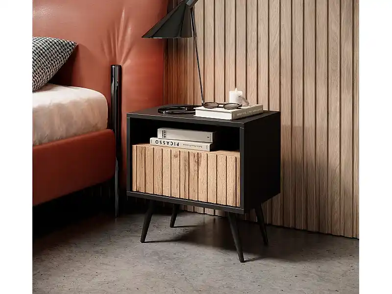 Nachttisch mit Schublade – Lamellenfronten – Schwarz / Wotaneiche – Bello Neu Im Sortiment
