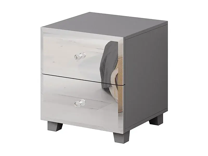 Nachttisch mit zwei Schubladen, grauer Korpus und Fronten mit Spiegeln der Kollektion LIVORA. Sonderaktion