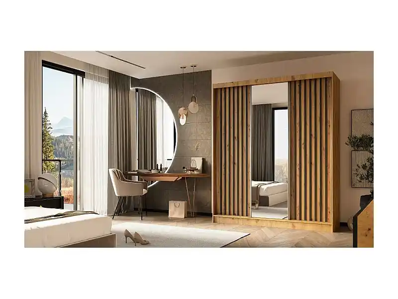Neue Ware SCHWEBETÜRENSCHRANK Helix 180/216/61 eiche artisan+schwarz mit Schubladeneinsatz
