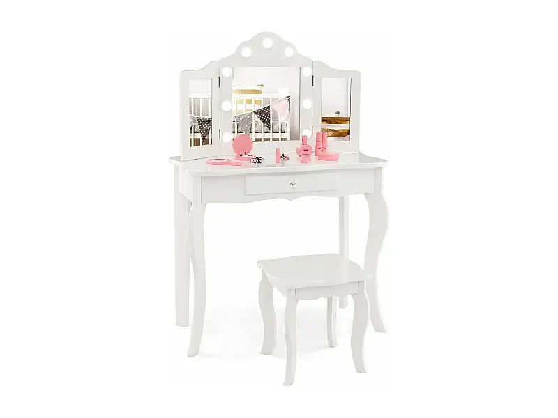Neuheit 2 in 1 Kinder Schminktisch, Frisiertisch mit LED-Leuchten, klappbarem Spiegel & Schubladen, Kosmetiktisch Prinzessin für Kinder Mädchen(Weiß) TK32457