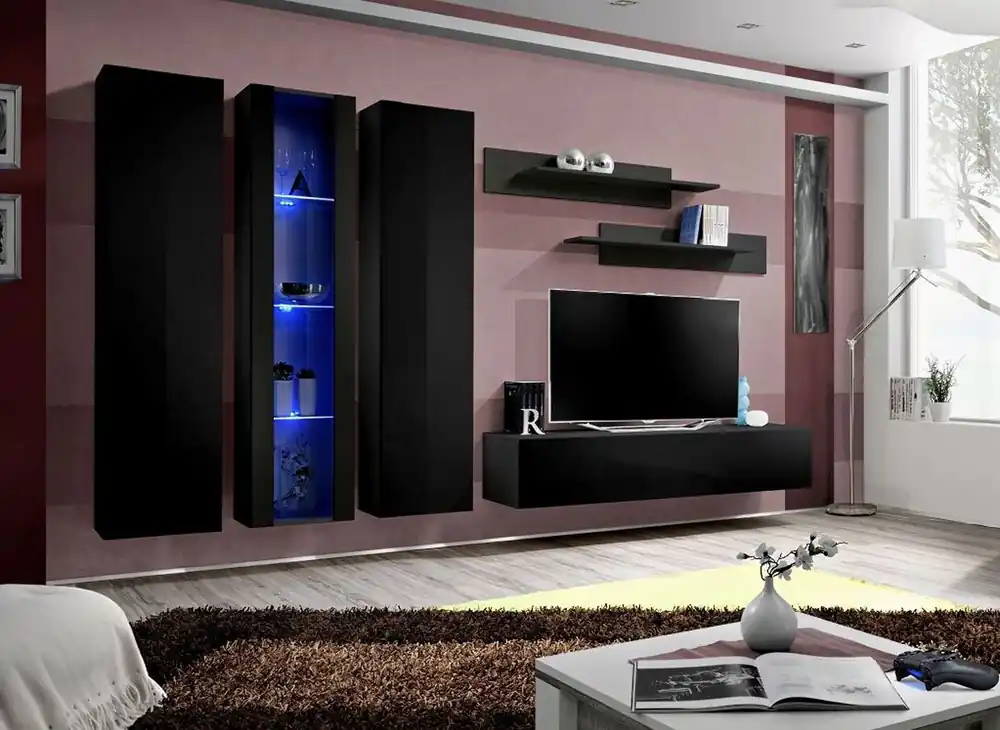 Die Moderne Wohnwand Hompland 36 bringt Eleganz und Raffinesse direkt zu Ihnen nach Hause. Die Farbe Schwarz dieser Wohnwand verleiht jedem Raum einen raffinierten und zeitlosen Look. Sie ist äußerst vielseitig und passt perfekt in jedes Wohnzimmerinterieur.