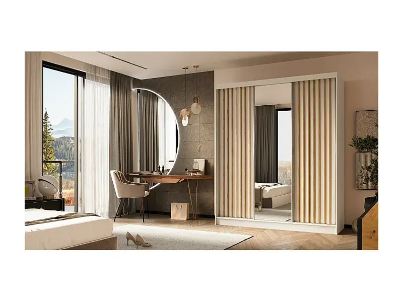 Preiswert SCHWEBETÜRENSCHRANK Helix 180/216/61 weiß+eiche artisan mit Schubladeneinsatz