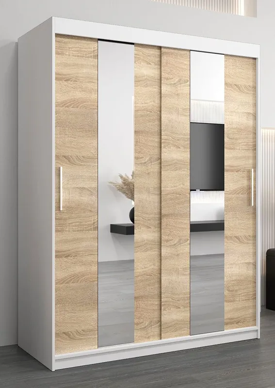 Schiebetürenschrank / Kleiderschrank Polos 03 mit Spiegel, Farbe: Weiß matt / Eiche Sonoma – Abmessungen: 200 x 150 x 62 cm (H x B x T)