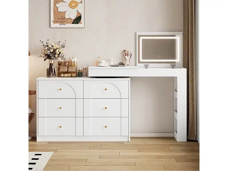 Schminktisch mit 7 Schubladen + Ablageflächen und Klappspiegel – 105 x 40 x 80 cm – LEDs – Spanplatte – Spanplatte – Weiß Sonderangebot