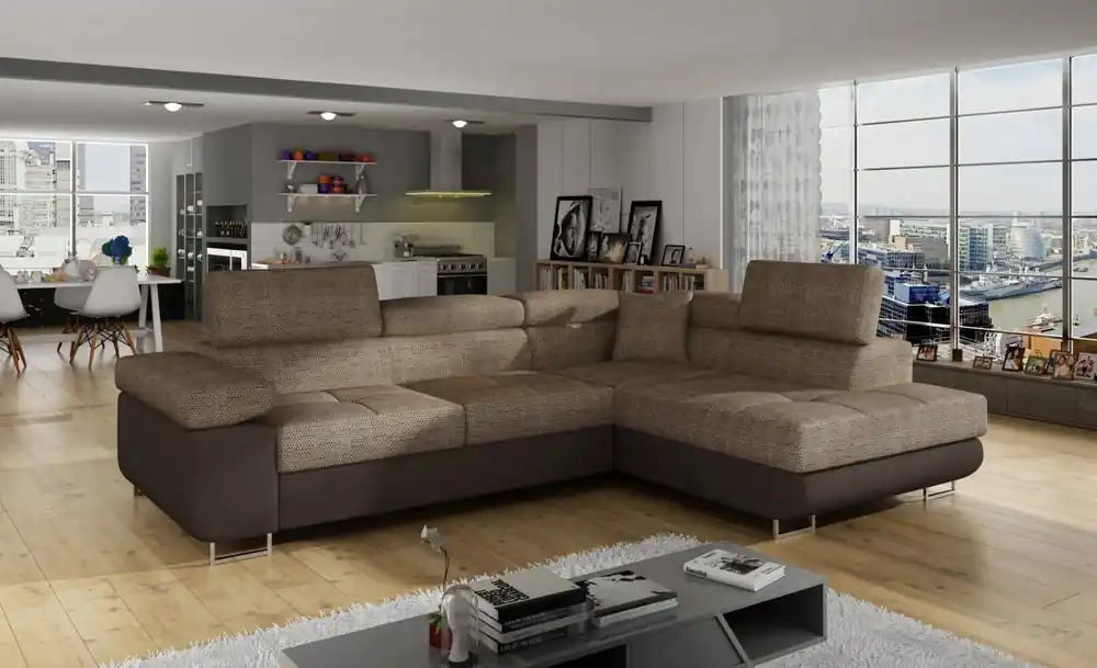 Stylisches Ecksofa Anton mit Schlaffunktion und Bettkasten beidseitig montierbar im robustem Luxus-Webstoff Flachgewebe  Auf die Plätze, Fertig, Los! Auf dem Ecksofa Anton von Black Red White mit einem Stellmaß von 289 x 189 ist genügend Platz, damit sich jeder seinen Lieblingsplatz sichern kann. Die knautschige Optik, die voluminösen und gemütlichen Polster mit vielen Kissen lassen das Ecksofa schnell zu ihrem persönlichen Lieblingsplatz werden. Der Besuch möchte doch spontan über Nacht bleiben? Eine integrierte Schlaffunktion lässt Anton im Handumdrehen in ein angenehmes Gästebett mit einer Liegefläche von 222 x 118 cm verwandeln. Das nötige Bettzeug können Sie einfach in dem unter der Bettfunktion gelegenen Bettkasten verstauen. Wählen Sie aus einer von vielen verfügbaren Farben und passen Sie Anton ihrem Wohnzimmer an. Das Sofa kann wahlweise mit Liegefläche links oder rechts aufgebaut werden. Finde bei Myhomelando dein Traumsofa für dein zuhause !!! Maße Ecksofa – alle Maße sind ca. Angaben Gesamt: 289 x 189 cm oder 189 x 289 cm Sitztiefe: 50 cm Sitzhöhe: 42 cm Rückenhöhe: 85 cm Ohne abgebildete Deko wie Kissen etc., Farbe auf dem Foto kann leicht vom Original abweichen (Bildschirm)