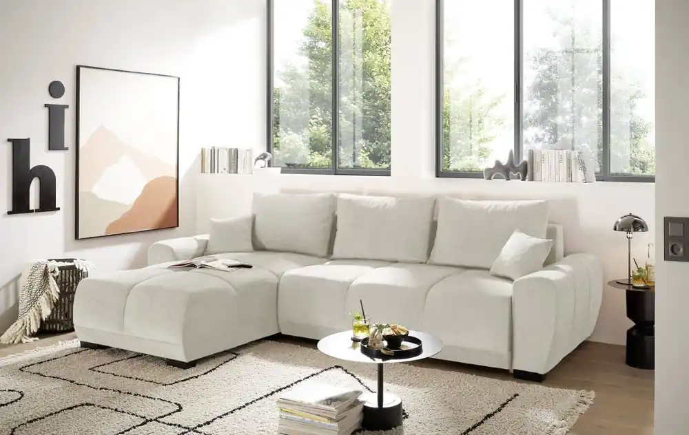 Stylisches Ecksofa Anton mit Schlaffunktion und Bettkasten beidseitig montierbar im robustem Luxus-Webstoff Flachgewebe  Auf die Plätze, Fertig, Los! Auf dem Ecksofa Anton von Black Red White mit einem Stellmaß von 289 x 189 ist genügend Platz, damit sich jeder seinen Lieblingsplatz sichern kann. Die knautschige Optik, die voluminösen und gemütlichen Polster mit vielen Kissen lassen das Ecksofa schnell zu ihrem persönlichen Lieblingsplatz werden. Der Besuch möchte doch spontan über Nacht bleiben? Eine integrierte Schlaffunktion lässt Anton im Handumdrehen in ein angenehmes Gästebett mit einer Liegefläche von 222 x 118 cm verwandeln. Das nötige Bettzeug können Sie einfach in dem unter der Bettfunktion gelegenen Bettkasten verstauen. Wählen Sie aus einer von vielen verfügbaren Farben und passen Sie Anton ihrem Wohnzimmer an. Das Sofa kann wahlweise mit Liegefläche links oder rechts aufgebaut werden. Finde bei Myhomelando dein Traumsofa für dein zuhause !!! Maße Ecksofa – alle Maße sind ca. Angaben Gesamt: 289 x 189 cm oder 189 x 289 cm Sitztiefe: 50 cm Sitzhöhe: 42 cm Rückenhöhe: 85 cm Ohne abgebildete Deko wie Kissen etc., Farbe auf dem Foto kann leicht vom Original abweichen (Bildschirm)
