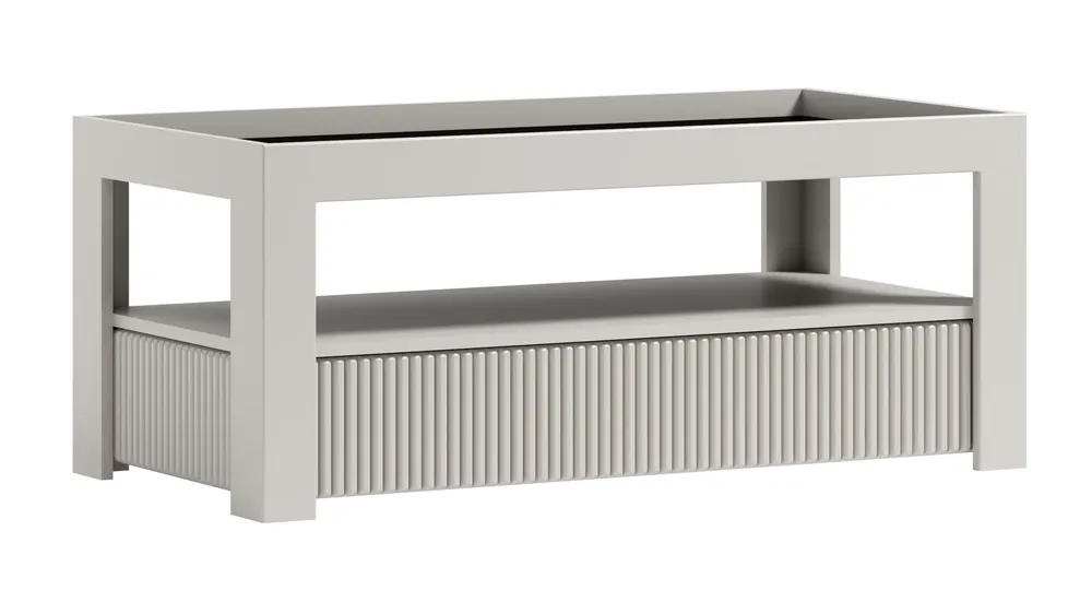 Couchtisch Kenungu 02 in Kaschmir, 53 x 121 x 61 cm, Rillenmuster an den Seitenflächen, braune Tischfläche aus Glas, 1 praktisches Ablagefach, modernes Design