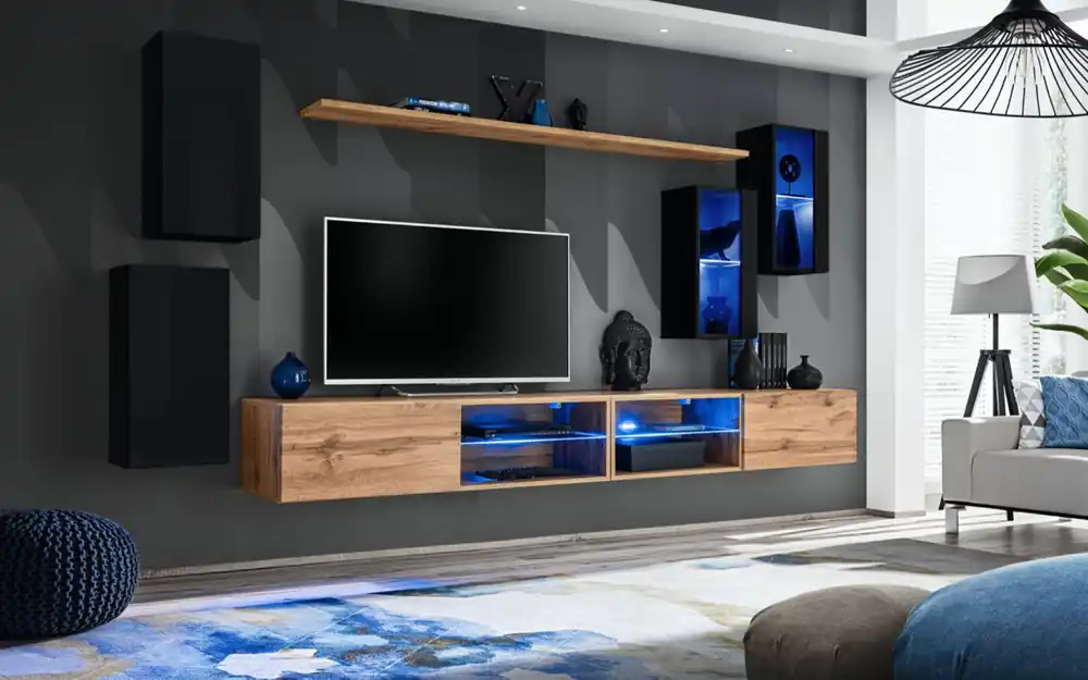 In der Farbe Eiche / Schwarz, passt diese Stylische Wohnwand mit Push-to-open Funktion Volleberg 78 perfekt zu jedem modernen Wohnstil und lässt Ihr Wohnzimmer in einem neuen Glanz erstrahlen. Die Oberfläche ist laminiert, was nicht nur ein schönes Aussehen garantiert, sondern auch die Langlebigkeit des Produktes sicherstellt.