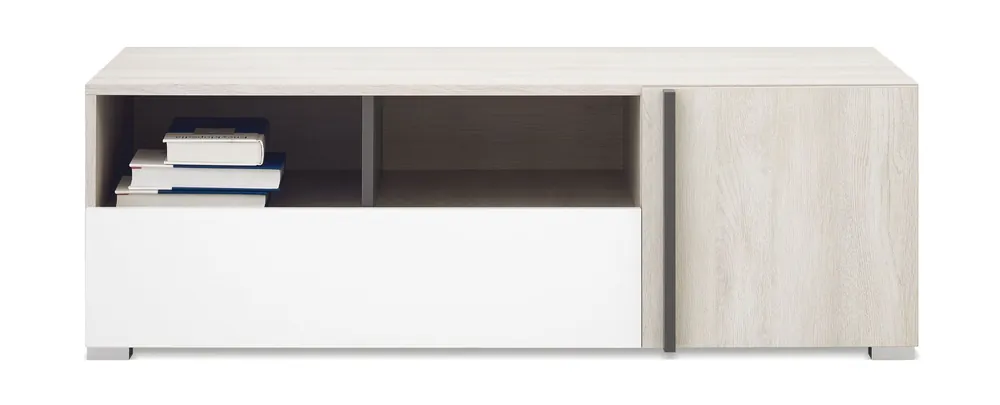 Entdecken Sie den neuen TV-Unterschrank mit einer Tür Schilde 12. Dieser TV-Unterschrank verleiht Ihrem Wohnzimmer nicht nur einen modernen und frischen Look, sondern bietet auch zusätzlichen Stauraum für Ihre Unterhaltungsgeräte oder Dekorationen. Die abwechselnden Farben von Eiche Weiß, Weiß, und Anthrazit verleihen dieser Einheit ein komplexes und einzigartiges Design, das sicherlich einen bleibenden Eindruck hinterlassen wird.