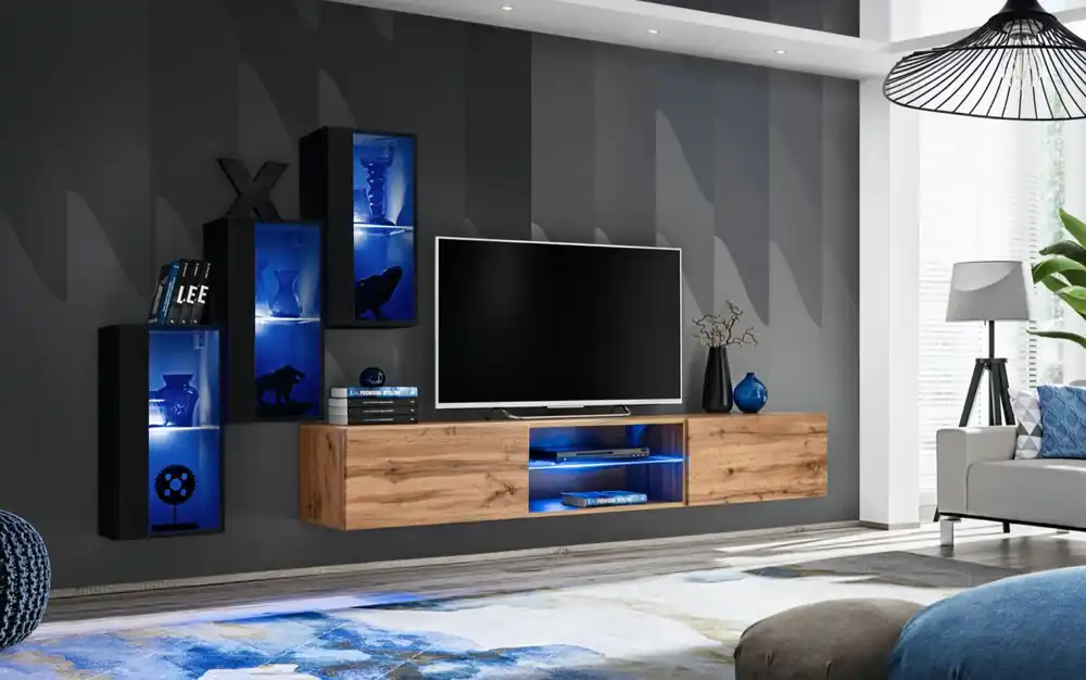 Entdecken Sie die Wohnwand mit blauer LED-Beleuchtung Volleberg 30 in der Farbe Schwarz / Eiche Wotan – ein Hort der Ästhetik und Funktionalität!