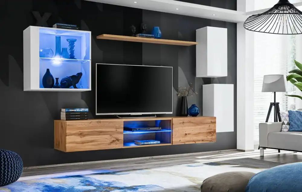 Die Wohnwand Volleberg 44 ist ideal für moderne Wohnzimmer geeignet. Das Weiß und Eiche Wotan schafft ein Gefühl von Wärme und Behaglichkeit, während die klaren Linien und das minimalistische Design den aktuellen Trends im Innendesign entsprechen.