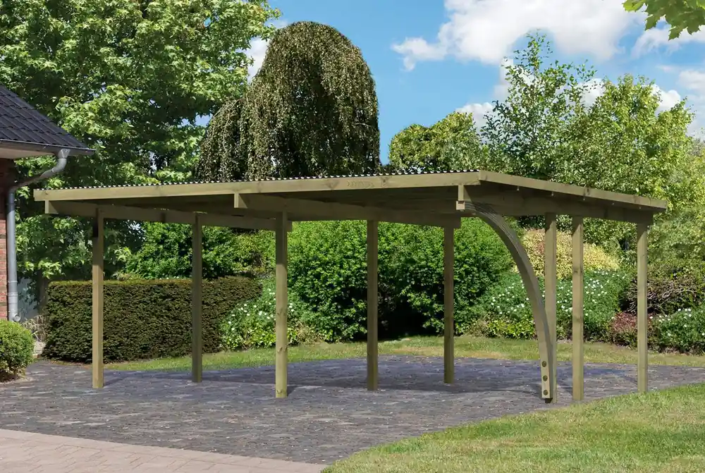 Das Carport bietet dank 9 massiver kesseldruckimprägnierter Pfosten (9 cm x 9 cm) viel Platz unter dem 27,2 qm großen Dach aus PVC. Das Carport schützt Ihr Fahrzeug vor Hitze im Sommer, Kälte im Winter und Witterungseinflüssen im ganzen Jahr. So erhalten Sie den Wert Ihres Autos langfristig. Das Carport hat eine Breite Innen von 509 cm bei einer Tiefe von 490 cm und bietet so genug Platz für Ihre Fahrzeuge. Die passenden H-Anker mit einer Länge von 60 cm finden Sie ebenfalls bei uns im Zubehör. Die benötigten Beschlagbeutel für die Montage sind bereits im Lieferumfang enthalten.