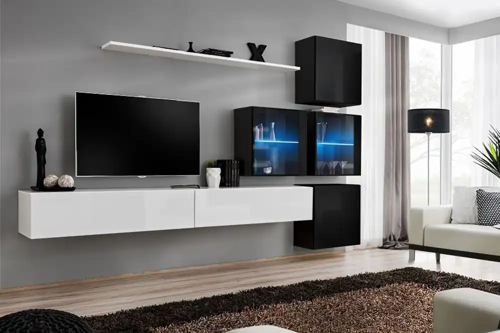 Entdecken Sie die hochwertige Elegante Wohnwand Balestrand 293. Sie ist perfekt für alle, die Modernität, Eleganz, Funktionalität und genügend Stauraum bevorzugen und ist gerade das, was Ihrem Wohnzimmer fehlt. Die Farbe dieser Wohnwand ist klassisches Weiß/ Schwarz und bindet sie subtil in Ihr bestehendes Wohnkonzept ein.