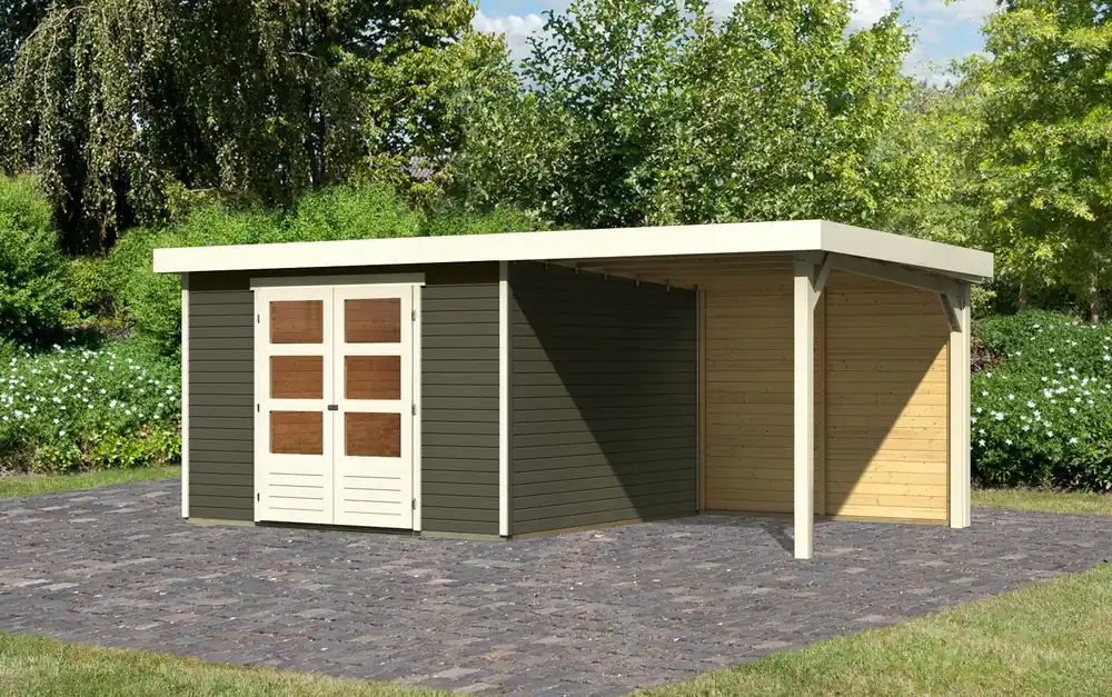 Gartenhaus SET AKTION terragrau mit Anbaudach 2,4 m Breite, Rückwand, Grundfläche: 9m²