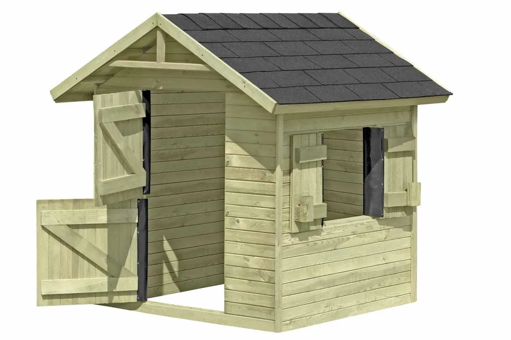 Abbildung zeigt Kinderspielhaus mit Dachschindeln, diese sind nicht im Lieferumfang enthalten.